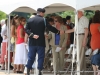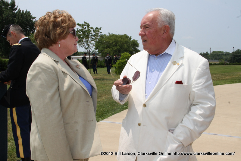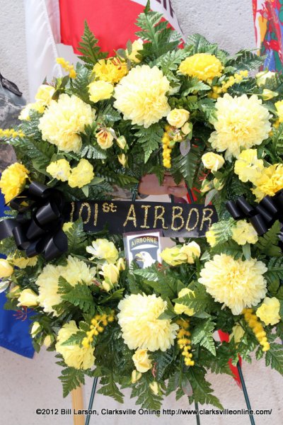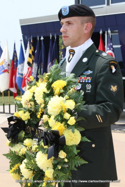 Maj. Gen. James C. McConnell, commander of the 101st Airborne Division (Air Assault), along with Command Sgt. Maj. Scott Schroeder prepare to lay the wreath honoring those of the 101st Airborne Division (Air Assault) has lost through the years, as Montgomery County Mayor Carolyn Bowers looks on from the audience.