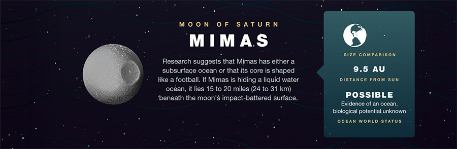 Europa and Enceladus are thought to have an ocean of liquid water beneath their surface in contact with mineral-rich rock, and may have the three ingredients needed for life as we know it: liquid water, essential chemical elements for biological processes, and sources of energy that could be used by living things.