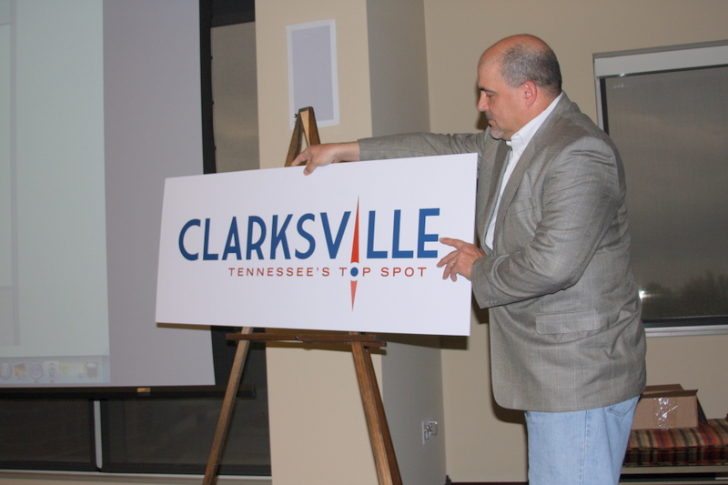 The technical development aspects having been dispensed with, McCloud began the unveiling. From his laptop he opened a projected animation which displayed the city’s name in large blue lettering against a white background. Then in the lower right-hand corner a small compass dial appeared and started to spin. Finally, a red compass needle materializes, rotates and settles True North, representing the “I” in Clarksville, as red lettering materializes below the city’s name, proclaiming, “Tennessee’s Top Spot!”. With that, a large easel billboard was turned around to show the new brand in hard copy. See photo above. “Clarksville – Tennessee’s Top Spot!” was launched. Commemorative key chains emblazoned with the new brand/logo in white lettering on a blue background, were then made available to the guests.