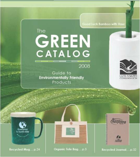 You can contact Promote Green at 931.220.2991. Promote Green has both print and online catalogs of marketing merchandise and also offers “The Green Book,” a green e-book catalog.