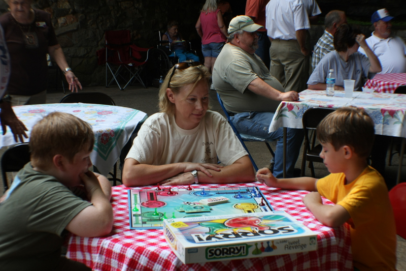 Volunteers will gather to set up chairs and tables on the hot muggy July afternoon. The first year when I helped set up the chairs and tables we were so hot that we put tables as close to the cave as we could get them. After awhile we had to move the tables away from the entrance because it was too cold. Refreshments such as cookies and lemonade are set out for the soon to gather crowd. The Musicians arrive, and guests start coming up the trail, many bearing their own board games or cards. They find a table and then spend the afternoon with old friends and perhaps making some new acquaintances as was done in days past. This event is so popular that the comment most repeated is, “When are you going to do this again?”