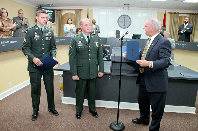 Clarksville, TN – Mayor Piper presented certificates to three men that saved a woman from a burning vehicle. Robert Anderson and Brian Hartbarger were at the presentation ceremony.