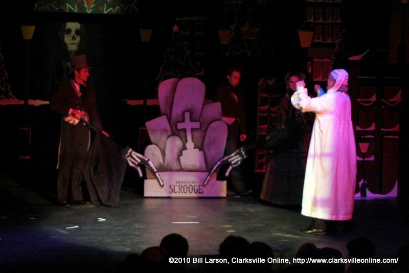 The set was well designed, at times giving the feeling and ambiance of a counting house, Victorian London, Scrooge’s bedroom, Fezziwig’s Shop, the Cratchit House, and his nephew’s home, and a graveyard. I loved the way the Ghost of Christmas Future was presented.