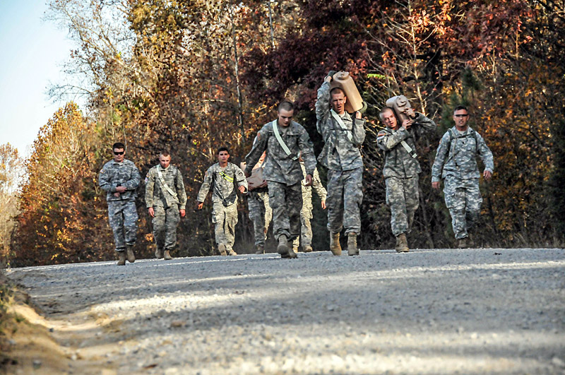 The two-day competition began with a non-standard Army Physical Fitness Test comprised of pull-ups, push-ups, sit-ups and a two-mile ruck-run. Then the teams conducted a mile and a half full combat load run and completed a standard air assault obstacle course. Then from the air assault course, performed an air assault mission in a UH-60 Black Hawk helicopter into the training areas, where the competitors began their three-mile road march towards the awaiting testing lanes.