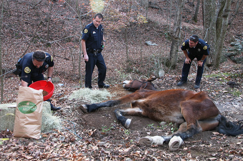 When officers arrived, they found the horse alive, laying on its side unable to stand. The ground was compacted around the horse where it appeared as though the horse had made repeated attempts to get up.