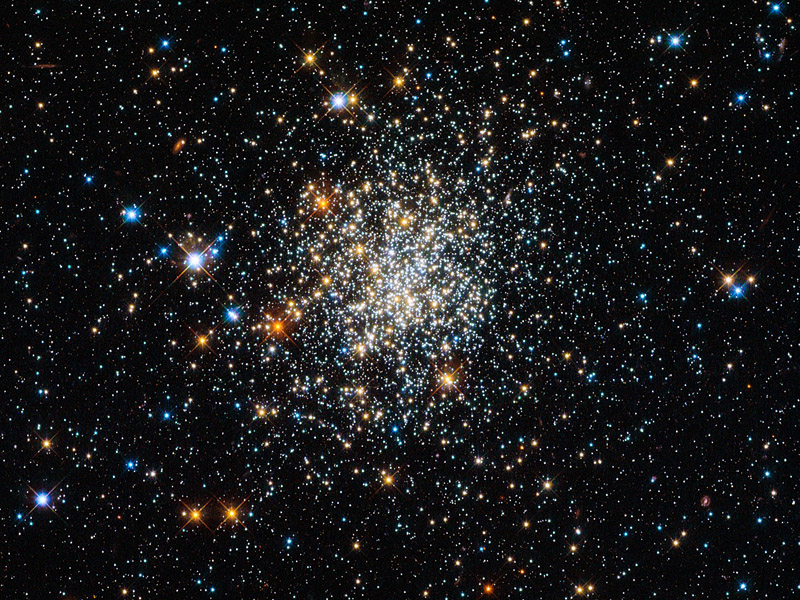 The stars in NGC 411 are all roughly the same age, having formed at one time from one cloud of gas. But they are not all the same size. Hubble’s image shows a wide range of colors and brightness in the cluster’s stars; these tell astronomers many facts about the stars, including their mass, temperature and evolutionary phase. Blue stars, for instance, have higher surface temperatures than red ones.
