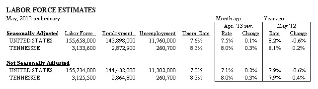 Nashville, TN – Tennessee Labor and Workforce Development Commissioner Burns Phillips announced the Tennessee’s unemployment rate for May was 8.3 percent, which increased three tenths of one percentage point from the April revised rate of 8.0 percent.