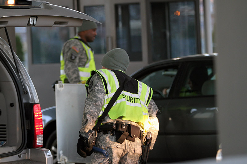 Three soldiers stop cars at the gate. Judging by outward appearances, including the fluorescent yellow vest, large black belts and pistols, the only thing different about these soldiers from the military police soldiers who normally staff the ACP is their patch. They all wear the 101st Airborne Division (Air Assault) eagle patch on their left shoulder.