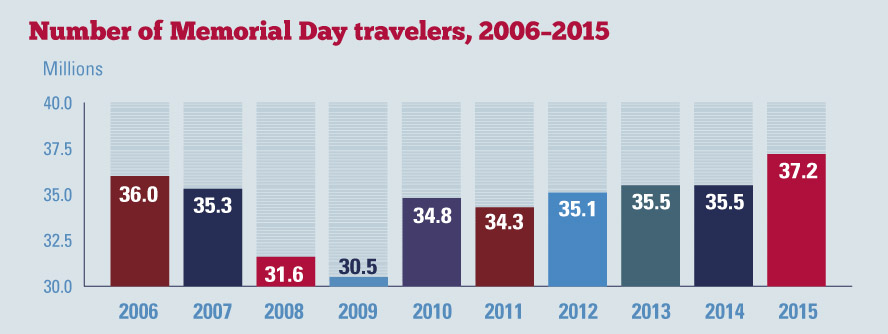 - More than 88 percent of travelers (33 million) will travel by automobile, an increase of 5.3 percent over last Memorial Day.