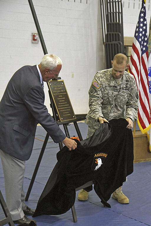 “The Sabo family, my wife Olga, three sons and seven grandchildren are very appreciative and honored that FortCampbell has chosen to dedicate the Freedom Fighter Gym to Leslie’s memory in renaming it the Sabo Physical Fitness Center,” George said. “Soldiers with the Screaming Eagles have done their duty with honor and valor. We want to sincerely thank you, the Soldiers of the 101st, for the role that you have played in defending our country and preserving our freedom. Thank you from the bottom of my heart.”