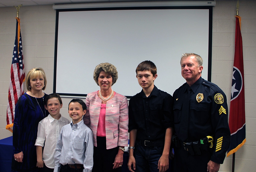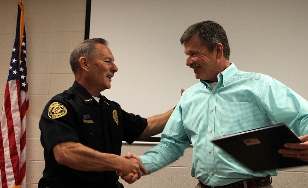 After Clarksville Mayor Kim McMillan’s opening comments, Deputy Chief Frankie Gray and Deputy Chief Michael Parr presented Sergeant Andy Hagewood with a Certificate of Retirement and Officer Cris Hill with a Promotion Certificate to the rank of Sergeant.