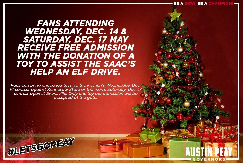 Austin Peay State University’s athletics department and its Student-Athlete Advisory Committee are seeking help to make the holiday season a little brighter for local families. Fans attending the Governors basketball games Wednesday, December 14th may receive free admission with the donation of a toy to assist the department’s Help An Elf drive.