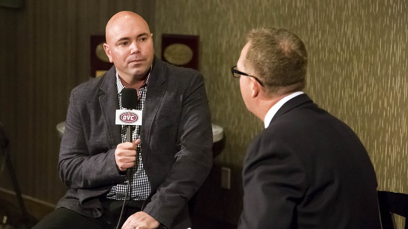 Evansville, IL – For first-year head coach Matt Figger, Tuesday ticked off another milestone in his inaugural run as Austin Peay State University head men’s basketball coach—first turn at Ohio Valley Conference Media Days at the newly-completed Evansville DoubleTree, a stone’s throw from the Ford Center—site of this season’s Ohio Valley Conference Basketball Tournaments.