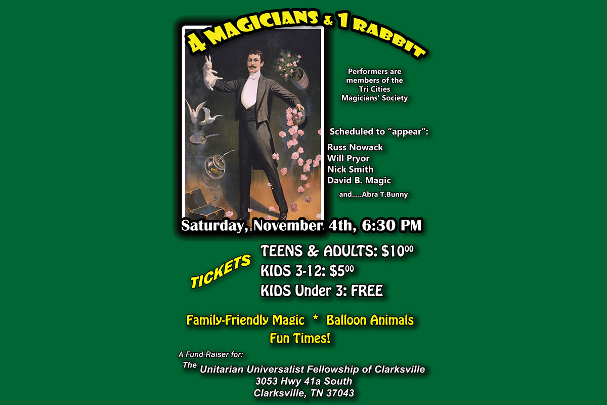 Clarksville, TN – Magic fans young and old can enjoy an evening of family-friendly entertainment this Saturday at the performance of “4 Magicians and 1 Rabbit.” The performance is being held as a fund-raiser at the Unitarian Universalist Fellowship of Clarksville beginning at 6:30pm, Saturday, November 4th, 2017.