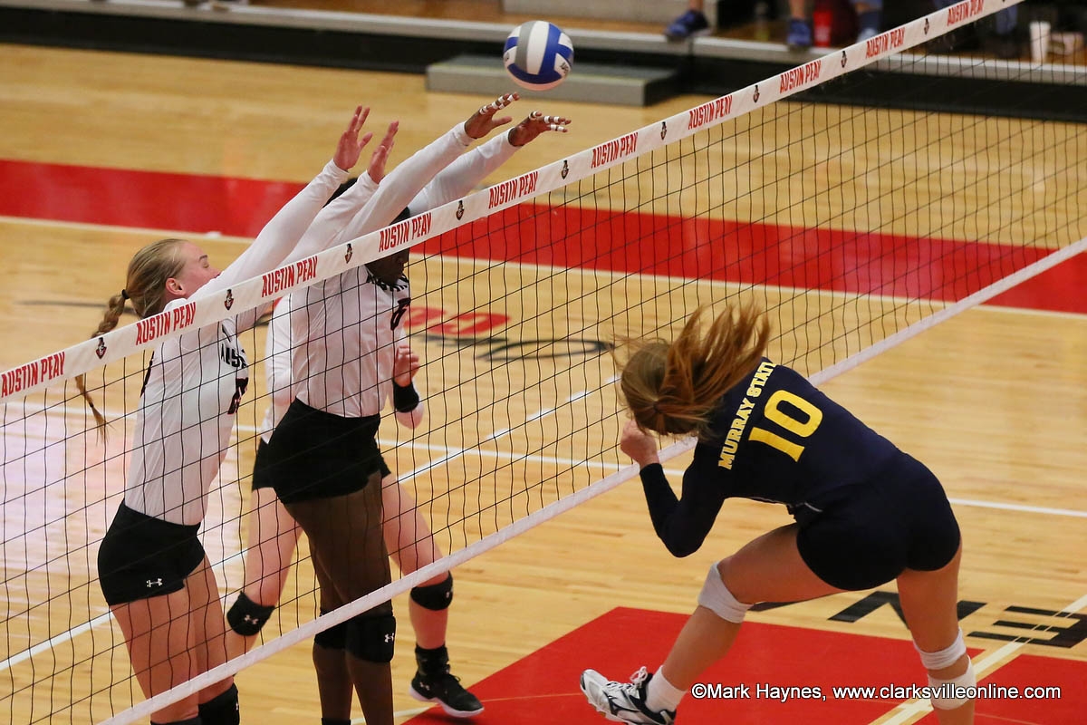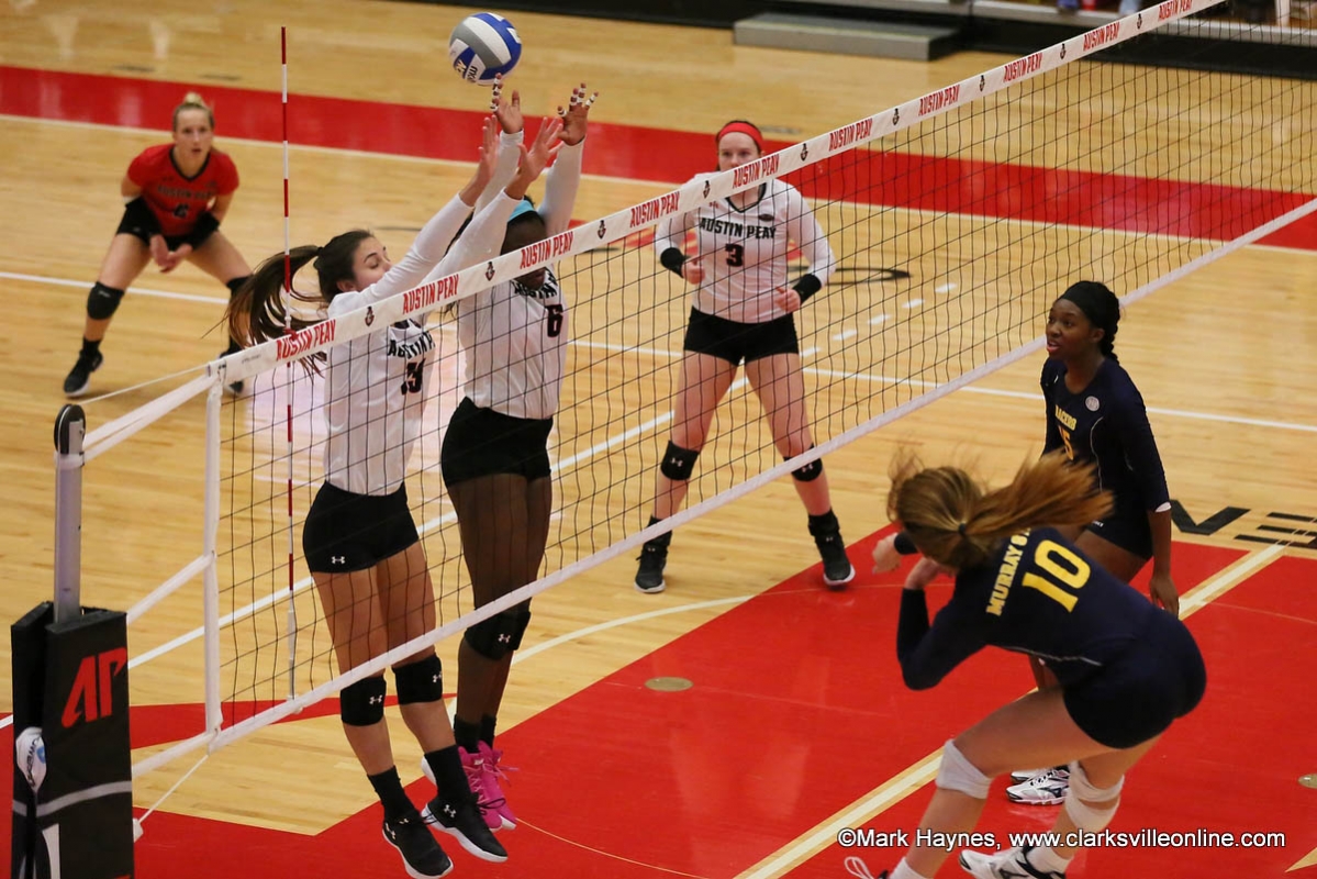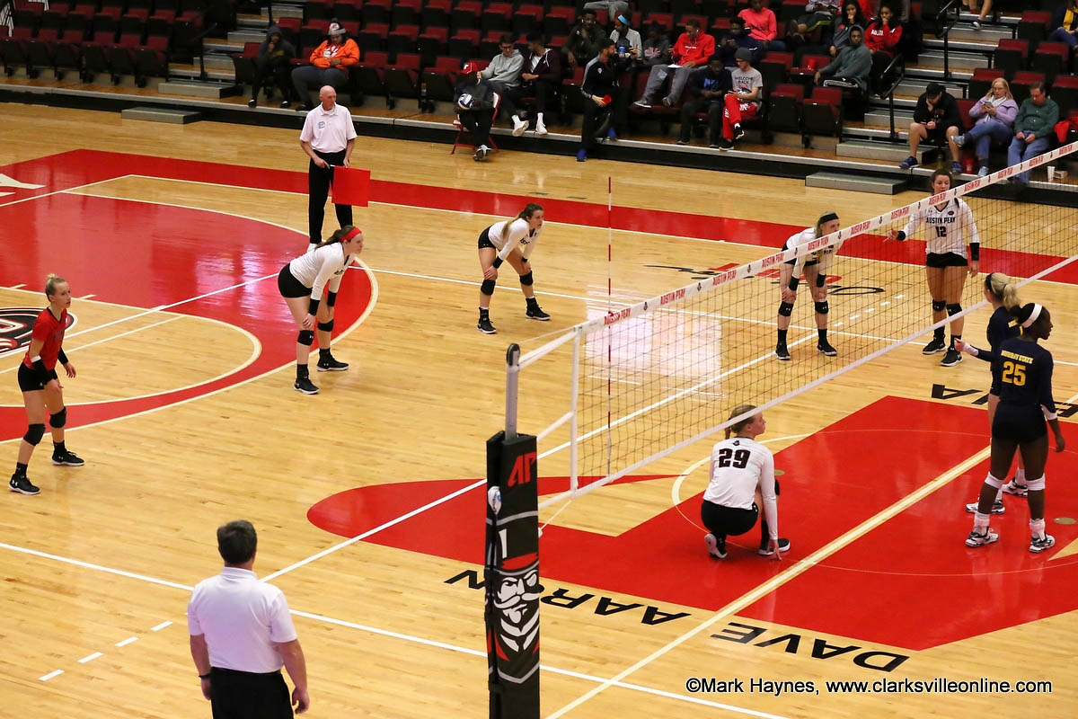 Austin Peay was held to 11 kills (.184 attack percentage) in the set but Murray State hit just .170 while scoring 15 kills.