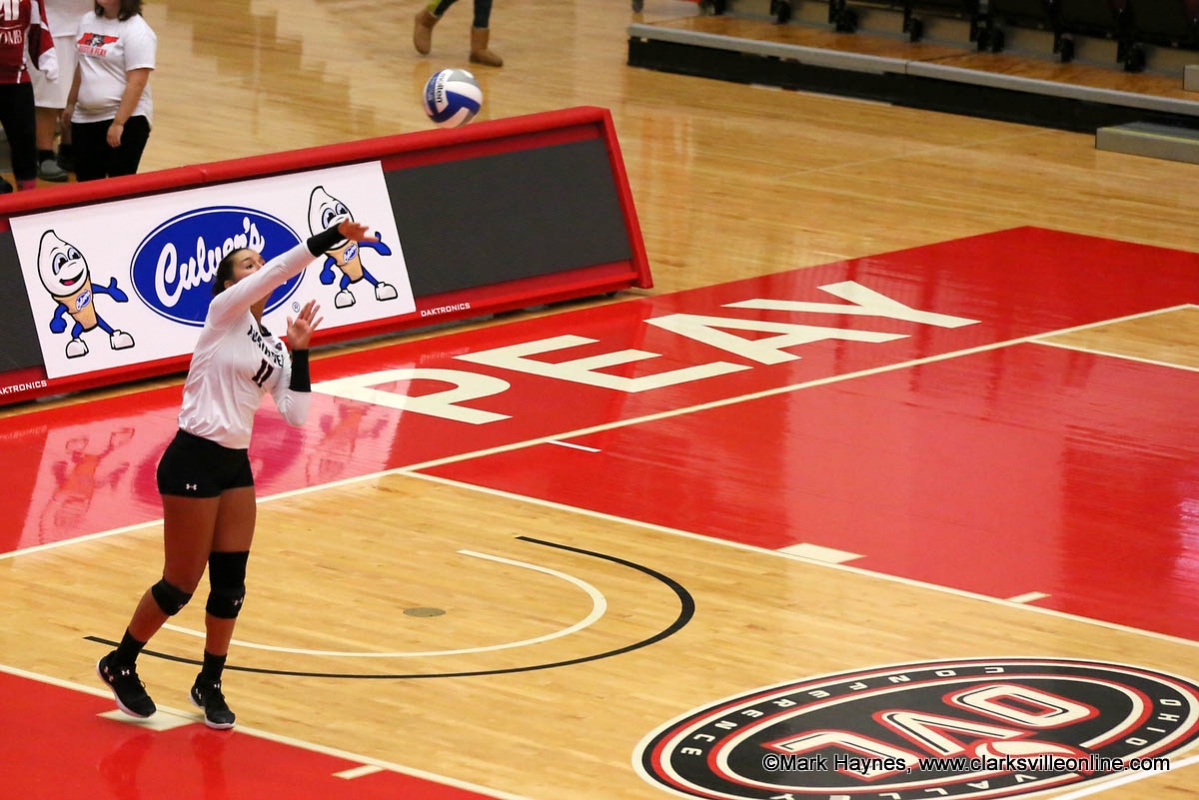 While Murray State did not trail in the fourth, Austin Peay did not go quietly. The teams traded big runs down the stretch, Murray State opening with a 6-1 burst before the teams traded four-point runs. The Govs scored four of five to get withing two points, 23-21, but Katrirah Johnson had a kill and chipped in on a match-sealing block to end the Govs threat.