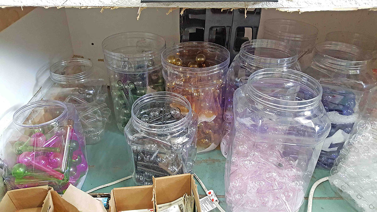 Also, numerous plastic containers containing assorted glass pipes in different sizes and colors were located behind the counter on the floor, for sale.
