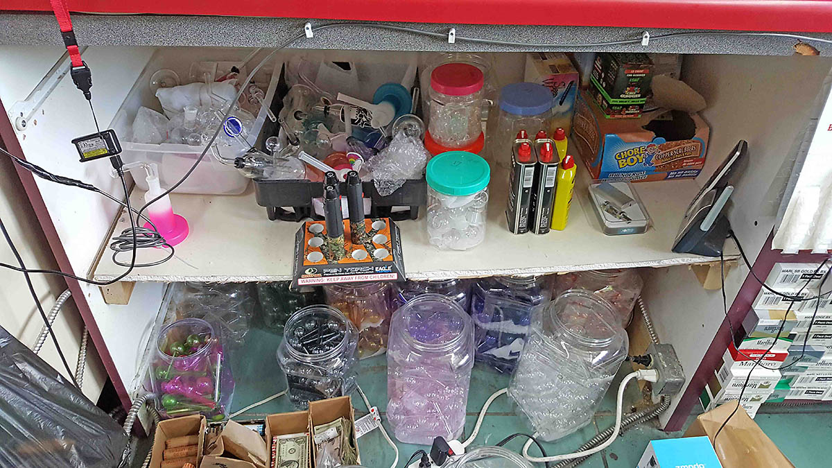 While agents were inside of the business, they observed unlawful drug paraphernalia in a glass case. There were metal pipes in the case along with grinders, digital scales, and devices with hidden compartments designed to hide items inside.