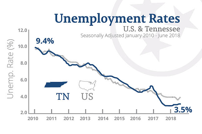 Nashville, TN – Tennessee Governor Bill Haslam and Tennessee Department of Labor and Workforce Development Commissioner Burns Phillips today released the statewide unemployment rate for June 2018 and it marked an entire year the jobless figure in Tennessee has been 3.5 percent or lower.