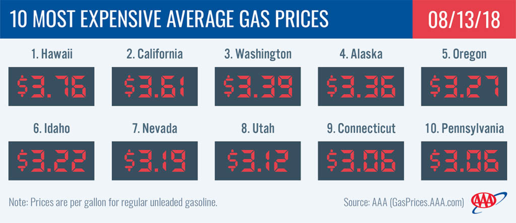 - The nation’s top 10 most expensive markets are: Hawaii($3.76), California ($3.61), Washington ($3.39), Alaska ($3.36), Oregon ($3.27), Idaho ($3.22), Nevada ($3.19), Utah ($3.12), Connecticut ($3.06) and Pennsylvania ($3.06).