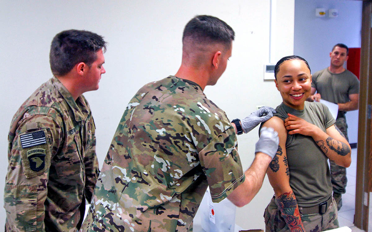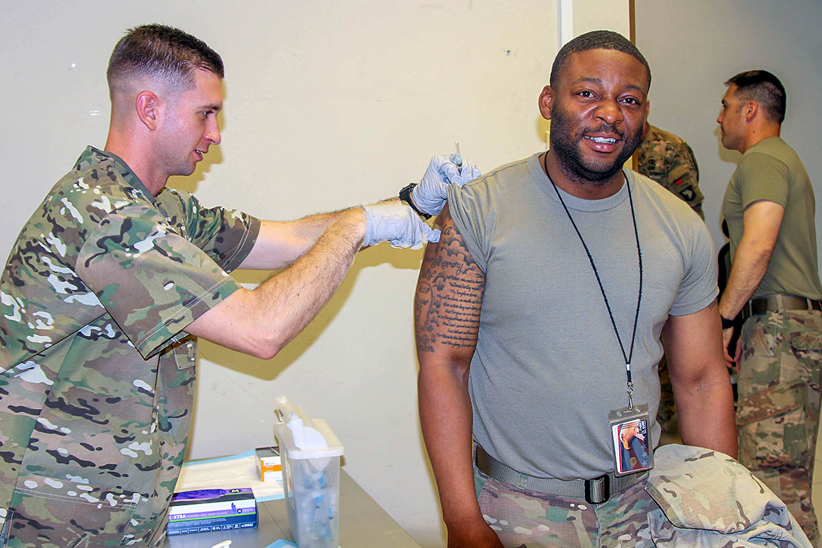 With ongoing operations, heightened battle rhythms, and 16-24 hour shifts, Maj. David Vise, the brigade’s medical operations officer, strategically planned to inoculate service members in the headquarters building to accommodate division and brigade staff elements.