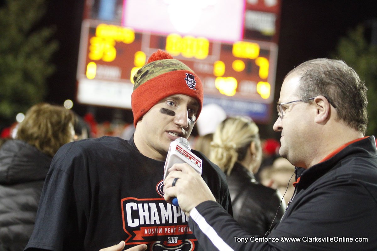 The clock has just hit zero as I type this from the Fortera Stadium press box. The scene on the field is unlike any I could ever conceive of, before we all learned to hope and before this program was raised from irrelevance. Players deliriously hugging. Coaches slipping on championship tees. “OVC! OVC! OVC!” chants spontaneously breaking out all over the place. It is a lovefest, with players and administrators, coaches and fans commingling as they celebrate.It’s just the beginning. Sunday at 11:00am we’re hosting a watch party in the Dunn Center. It’s where APSU football will find out its opponent for the opening round of the FCS playoffs.