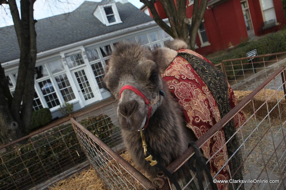 One of the most popular areas was the live nativity scene on the front lawn of the offices of Runyon and Runyon. Visitors to the attraction were treated to some animals that are not often seen in Clarksville. There were Jacob Sheep, a British breed with interesting coloring and four impressive horns. There was also a Zebu, a small South Asian cow with a fatty hump on its shoulders, and a beautiful Bactrian Camel that made its way into countless selfies.