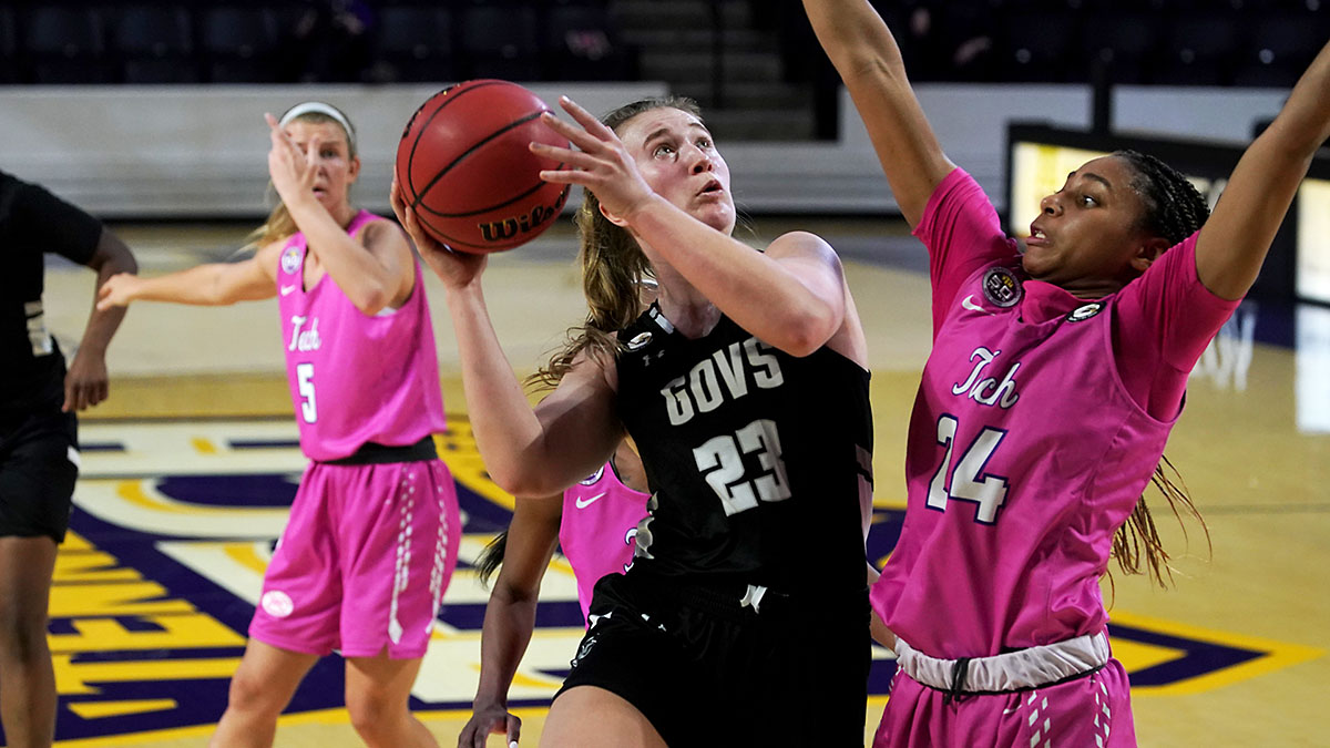 D’Shara Booker led the Govs with 10 points and a career-high 10 rebounds, posting her career’s first double-double in the contest. Maggie Knowles also pulled down a career-high eight rebound and drilled a trio of three-pointers en route to a team-high 11 points against the Gamecocks.