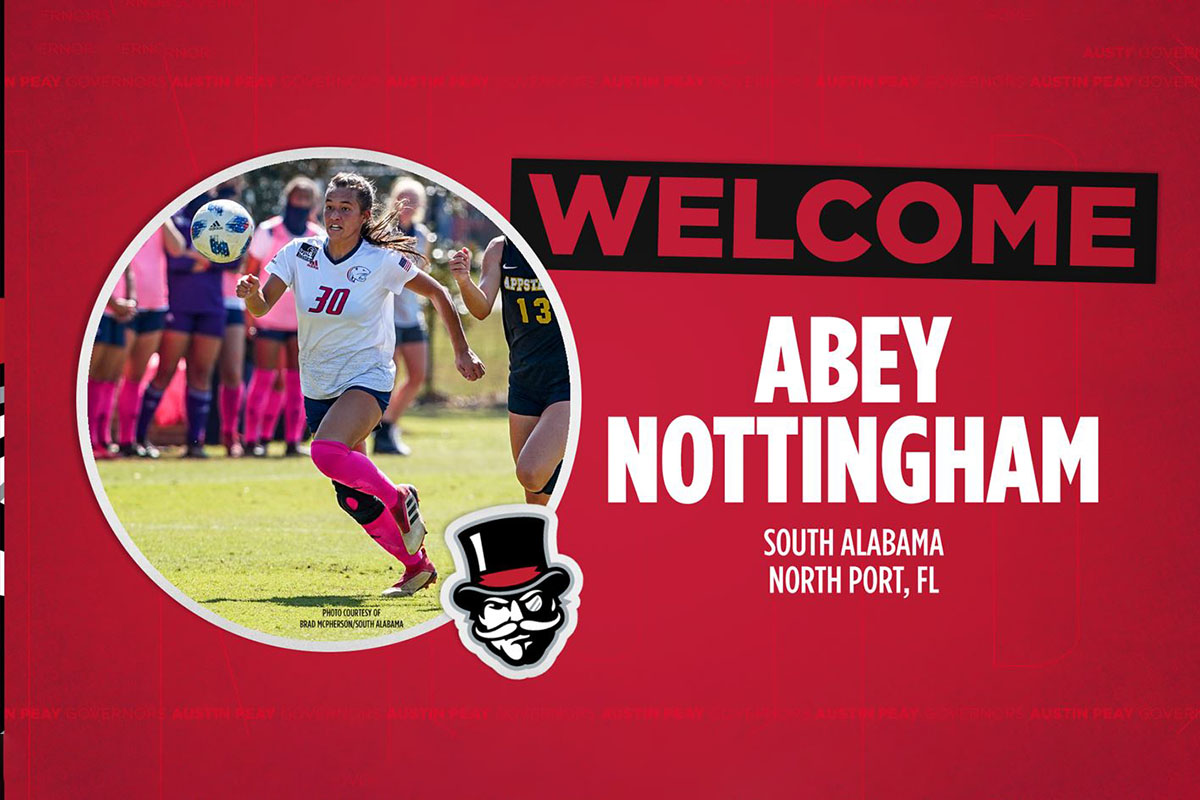 Clarksville, TN – Austin Peay State University (APSU) head soccer coach Naomi Kolarova has added transfer Abey Nottingham, a defender who spent a pair of seasons at South Alabama, to the Governors’ roster for the upcoming season.