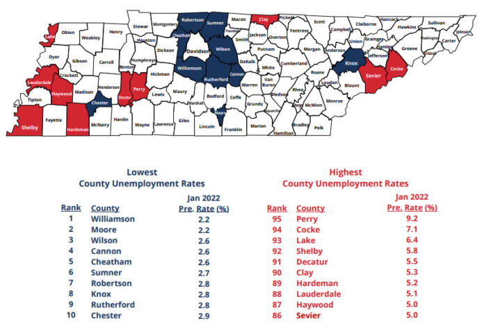 Tennessee Counties Start 2022 with an uptick in Unemployment