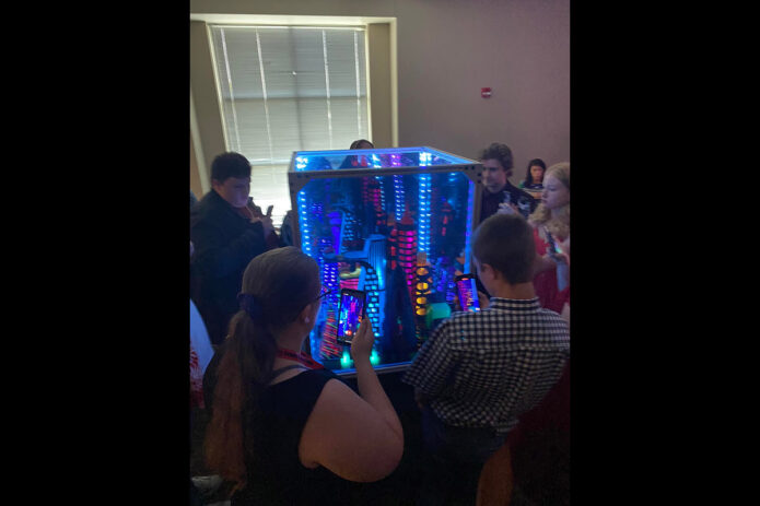 Over five weeks in June and July, the students learned the 3D printing skills they needed to construct an infinite city – a block of LED-illuminated buildings set in a mirrored box, creating the illusion of an endless cyberpunk city.“This isn’t based on anything I saw – I actually couldn’t find many reference photos for a four-way infinite hypercube like this,” said Blue Tinsley, an Austin Peay English student who with his mastery of 3D printing stepped up to help teach the class. “But I was trying to come up with a project each of these students could use, and I wanted to use our belt printer.