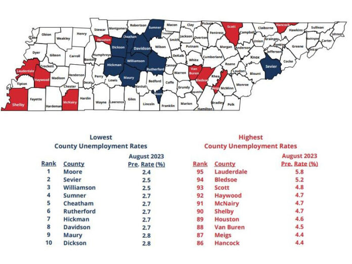 Nashville, TN – Ninety-three of Tennessee’s 95 counties recorded lower unemployment rates in August 2023, according to new data from the Department of Labor and Workforce Development (TDLWD). Unemployment for the month remained unchanged in Cheatham County and Lauderdale County.