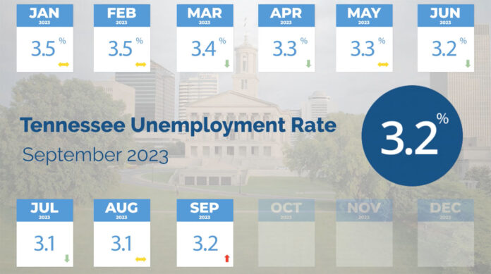Nashville, TN – Tennessee’s unemployment rate for September 2023 inched up slightly from the state’s all-time low rate of 3.1%. Data from the Department of Labor and Workforce Development (TDLWD) showed the seasonally adjusted rate increased by 0.1 of a percentage point to 3.2% during the month.