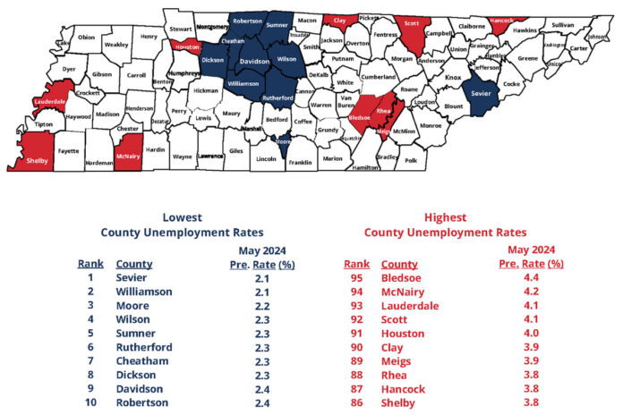 Sevier County and Williamson County had the lowest unemployment rate in the state in May, at 2.1%. Sevier County’s number was unchanged from the previous month, while Williamson County’s rate inched up 0.1 of a percentage point.
