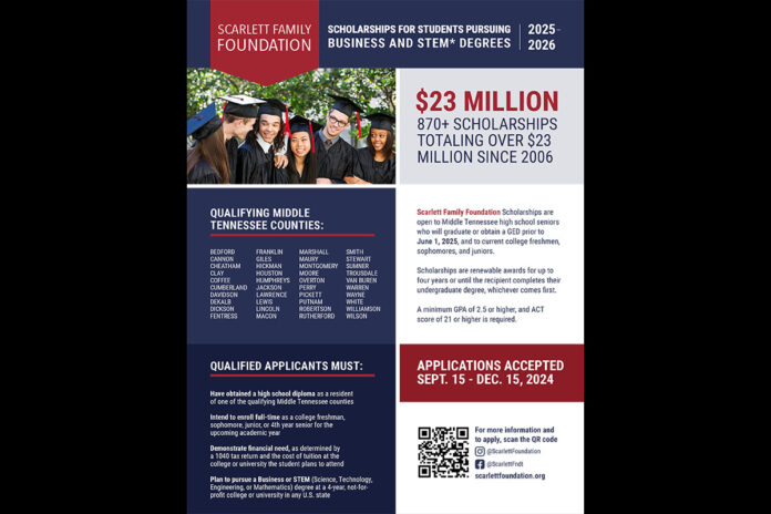 Nashville, TN – The Scarlett Family Foundation announced they will be accepting College Scholarship applications from September 15th to December 15th, 2024. High School Seniors graduating in the class of 2025 from any high school in Middle Tennessee’s 40 Counties are eligible to apply.