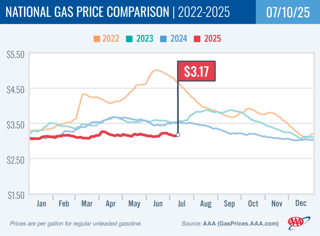 It’s been four years since the national average has been this low during the summer. This season’s lower pump prices are due to an abundance of supply in the oil market. Halfway through the year, the national gas price comparison chart shows how steady prices have remained in 2025 compared to recent years.